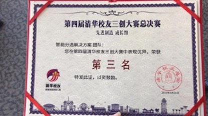 北京钱柜qg777科技有限公司在2019年清华大学校友会举办的创意创新创业“三创”大赛中获得全球先进制造总决赛成长组第三名